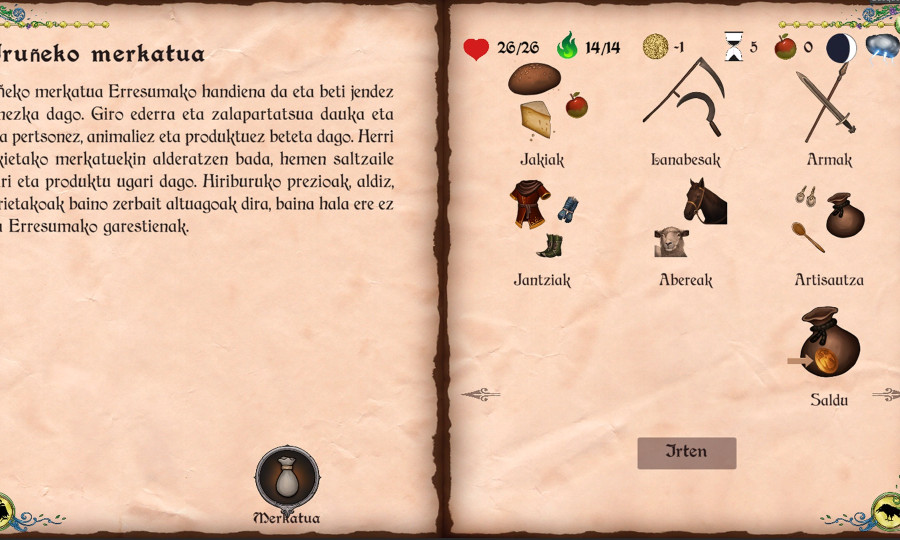 Bideojokoa gutxienez Windows-erako kaleratuko da, eta lortzen den aurrekontuaren arabera Linux-erako (beraz Steamdeck-erako) eta Android-erako bertsioak ere prestatuko dira (telefono mugikorrak eta tablet-ak). Bideojokoa bakarka jolasten da eta bertan hainbat istorio, gertaera, abentura eta erronka aurkezten zaizkio jokalariari. Horretarako, irudiak eta testua erabiltzen dira leku eta erronken deskribapenetan. Kolorezko irudi ugari dago hiribilduak irudikatzeko, merkatuetan eta pertsonaiaren fitxan aurki daitezkeen objektuak erakusteko, eta baita borroketako aurkariak, atzealdeak eta mapa azaltzeko orduan.
